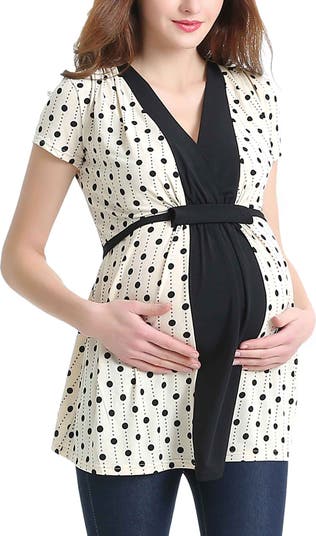 Designed to grow with you through every stage of pregnancy and beyond, this stylish maternity top blends comfort, function, and timeless style. Featuring a flattering empire waist and soft V-neckline, it drapes beautifully over the baby bump while offering discreet, easy nursing access. The contrast polka dot print and waist tie detail create a polished look that transitions effortlessly from casual wear to work or outings. Crafted from a soft, stretchy fabric, this maternity and nursing top provides all-day comfort without sacrificing shape. Perfect for pregnancy, postpartum, and breastfeeding, it’s a versatile essential for your maternity wardrobe.