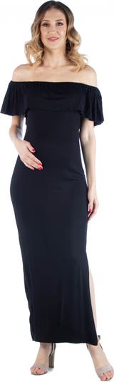 24seven Comfort Apparel Maternity Off Shoulder Ruffle Detail Maxi Dress, Main, color, Black