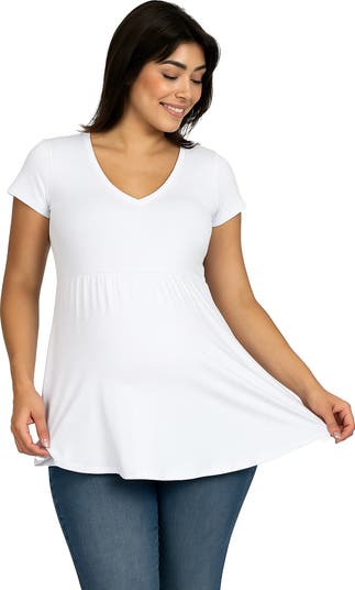 This simple yet chic maternity top features a flared hemline paired with a slim fit waist design that offers a comfortable fit for all silhouettes. Its a trendy and classy must have piece featuring an elegant v neck and flattering length. This comfortable top is designed with a relaxed loose fit, extended length, and a figure flattering flared shape. With its short sleeves and v neck, this fashionable Tshirt is easy to style. Pair it with jeans and flats for a cute yet comfortable look. Made from a comfortable stretch material. Rayon Spandex Knit.