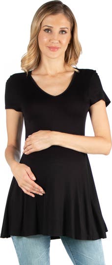 This simple yet chic maternity top features a flared hemline paired with a slim fit waist design that offers a comfortable fit for all silhouettes. Its a trendy and classy must have piece featuring an elegant v neck and flattering length. This comfortable top is designed with a relaxed loose fit, extended length, and a figure flattering flared shape. With its short sleeves and v neck, this fashionable Tshirt is easy to style. Pair it with jeans and flats for a cute yet comfortable look. Made from a comfortable stretch material. Rayon Spandex Knit.
