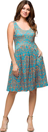 24seven Comfort Apparel Maternity Sky Blue Sleeveless Pleated Knee Length Pocket Dress, Main, color, Blue Multi