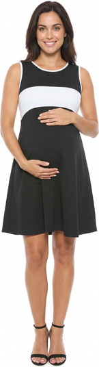 This maternity sleeveless knee length dress from 24seven Comfort Apparel features a classic round neckline and a relaxed A Line fit that flows gently for effortless comfort. Slightly flared for easy movement, it is accented with a bold white stripe across the bust. Made from smooth, slightly textured fabric with a lightly structured look, it is machine washable and tumble dry for simple care.