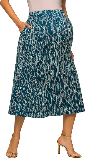Step into seasonal sophistication with the Teal Geometric Print Elastic Waist Maternity Pocket Midi Skirt. Designed with a flattering A line shape and a flowy midi length hem, this skirt combines style with comfort. The elastic waistband ensures a perfect fit, while the convenient side pockets add functionality. The bold teal geometric print makes it a versatile piece for fall outings, casual days, or dressy occasions. Made from lightweight, breathable fabric, it is a must have addition to your