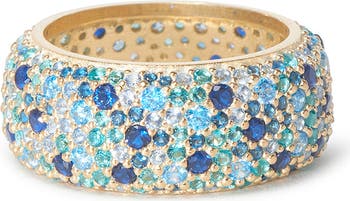 The Mathew Ring is encrusted with three different size crystals throughout. The different sizes together give off a more dramatic sparkle.
