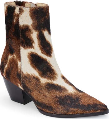 A slender silhouette updates a Western-inspired boot set on a chunky, stacked heel and shaped with an elongated pointy toe.