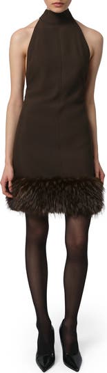 The fur is faux, but the attitude will be real when you step out in this scintillating stretch-crepe minidress finished with a plush hem of faux fur.