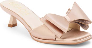 Tiny crystals dazzle the inner bow at the toe of this darling sandal set on a tapered kitten heel.