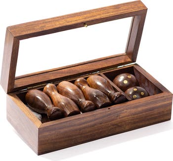 Bring a playful spirit to your desk or coffee table with our Rosewood Bowling Game Set. Hand-carved from sustainably sourced Indian rosewood, this mini set includes 10 polished pins and 2 balls, each detailed with brass inlay for a touch of artisan craftsmanship. A fitted glass-lid box keeps the set neatly stored and ready for display when not in use. Perfect for casual play, décor, or gifting, this set combines the nostalgia of a classic game with the beauty of handcrafted design.