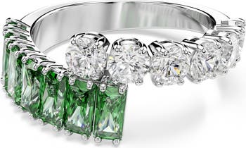 Color and shape collide in this statement ring featuring an overlapping design with clear round- and green baguette-cut crystals that bring modern sparkle to any look.