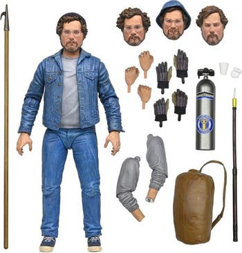Celebrate 50 years of Jaws with NECA! Considered one of the greatest achievements in film, the classic 1975 Steven Spielberg thriller paved the way for what would become the summer blockbuster. The iconic character Matt Hooper, portrayed by Richard Dreyfuss, is now available as an Ultimate action figure. Standing in 7-inch scale, the young oceanographer is equipped with multiple interchangeable heads, hands, and gloved hands. Plus, fishing hook, scuba tank, cup, crushed cup, shark dart, and duffel bag. He also features interchangeable arms for an alternative look in his denim jacket or sweater. Comes in collector-friendly window box packaging with opening front flap.