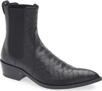 Tom Ford's impeccable craftsmanship shines through on this pointed-toe Chelsea boot made of burnished calfskin leather textured with rich snakeskin embossing.
