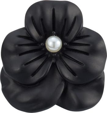 Meticulously crafter flower lapel pin in matte black finish with faux pearl of crystal accent, white pearl center, and Black center.