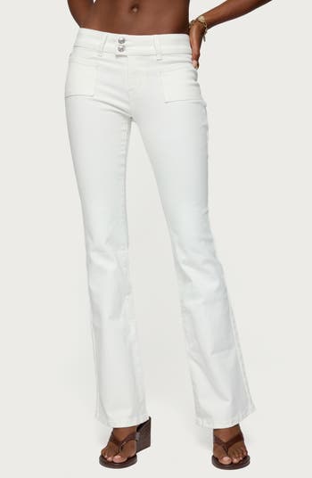 Serve retro-cool style in these low-rise flare jeans made with patch pockets, full-length legs and plenty of comfy stretch.