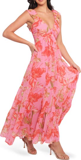 A vibrant floral print makes a delightful statement on an A-line dress featuring ruffled straps and a tiered skirt.