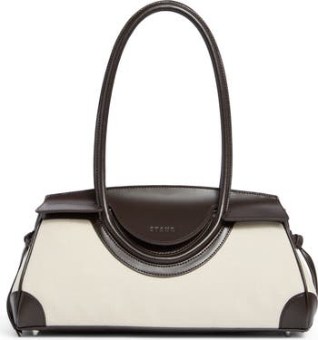 The Maude family welcomes its newest addition with this shoulder-bag version updated in a structured East/West silhouette of canvas and leather. The rolled shoulder straps are integrated into the body of the bag, creating an uninterrupted loop that's especially stylish.