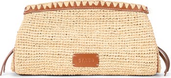 Raffia straw and a slim, geometric profile distinguish a versatile clutch secured with a zip closure perfect for storing your small on-the-go necessities.