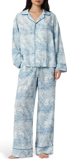 Find your way to dreamland in comfy pajamas traced in piping and mapped in a captivating print.