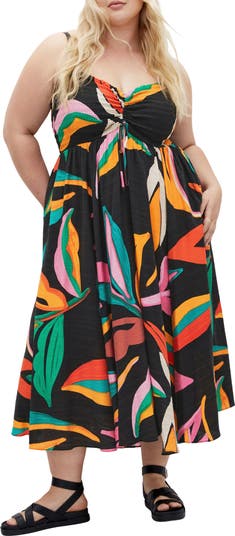 A vibrant tropical print brings sunny charm to this midi sundress designed with a shirred drawstring bust for an adjustable, flattering fit. Slim adjustable straps and a breezy silhouette keep the look light and effortless, making it perfect for vacations and weekend outings.
