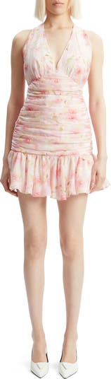 A flouncy skirt gives a little movement to this ruched, curve-hugging minidress topped by a shoulder-baring halter neck and perfect for your next party look.