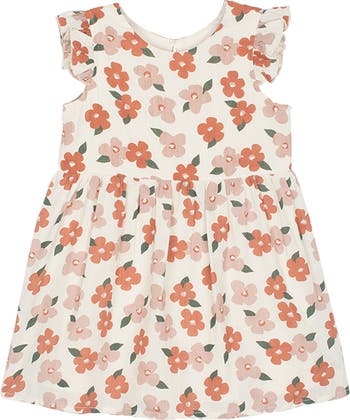 This girl's dress features warm coral-hued blossoms. Designed with flutter sleeves, a classic round neckline, and a gathered waist for a twirl-worthy skirt. Fabric Care 65% COTTON 35% VISCOSE / 100% POLYESTER Machine Wash Cold | Line Dry | Do Not Bleach