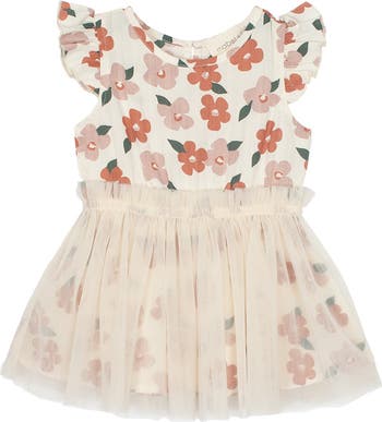 This girl's dress features soft, earthy-toned blooms. The top has flutter sleeves and a round neckline, while the skirt flows into layers of airy tulle for added volume. The blend of textures and muted colors creates an elegant look, perfect for any occasion. Fabric Care & Content Machine Wash Cold | Line Dry | Do Not Bleach 65% Cotton 35% Viscose