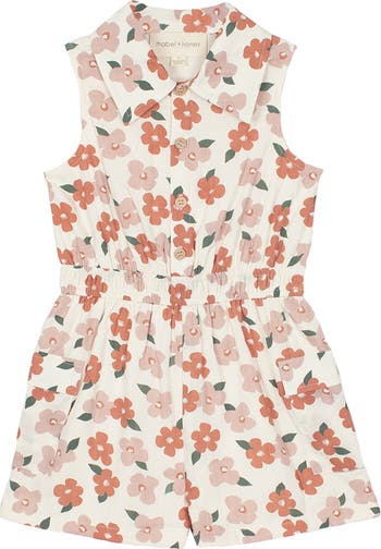 This sleeveless collared romper features features soft, earthy-toned blooms. It has a button-up front, an elastic waist for a comfortable fit, and flowy shorts for easy movement. Perfect for warm-weather outings. Fabric Care & Content Machine Wash Cold | Line Dry | Do Not Bleach 65% Cotton 35% Viscose