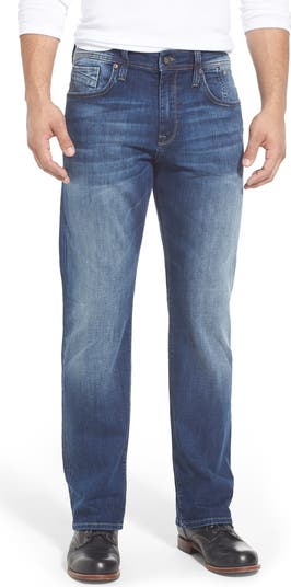 Soft whiskering and hand-sanding brush up the watery dark wash of relaxed-fit stretch-denim jeans, designed for lasting all-day comfort.