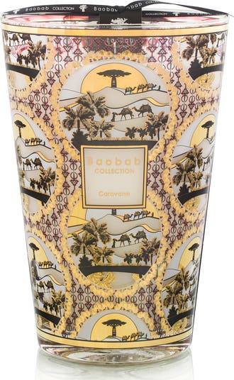 Fragrance story: A woody fragrance of fir, wood fire and vetiver will spread through your home like the magic of a fireplace to celebrate the holidays. Featuring a 24-carat gold screen-printed design, the candle depicts camels crossing the desert, laden with treasures and precious goods, evoking the spirit of trans-Saharan trade. The background, adorned with a red and green fibula motif, adds a festive touch reminiscent of a Christmas tree.