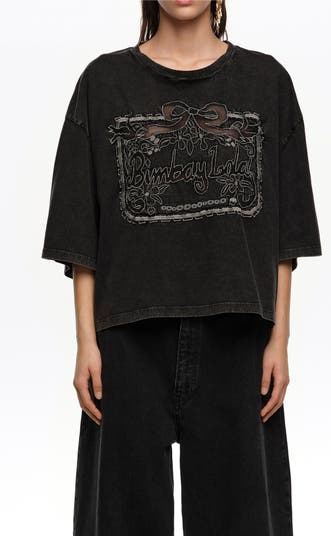 Cropped oversized T-shirt crafted from a cotton-blend fabric. Featuring a crew neckline, short straight wide sleeves, and maxi broderie anglaise detailing on the front