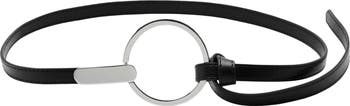 A striking silver buckle adds a modern mood to a slim faux leather belt that will complete lots of looks.