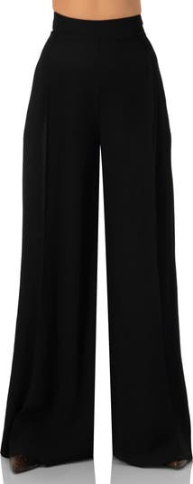High-waisted trousers feature a wide-leg silhouette with soft drape and structured tailoring