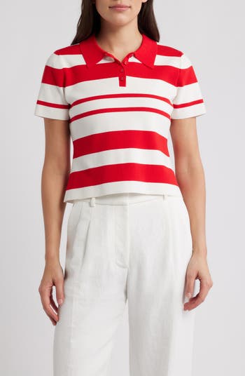 Equal parts playful and pulled-together, this abbreviated polo comes traced in variegated stripes that feel in motion then finishes in a soft, airy knit with tonal buttons to keep it sleek.