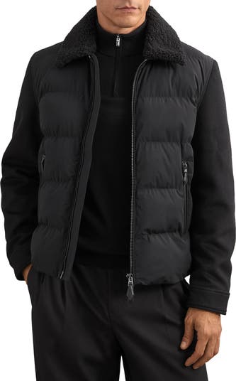 Be fearless against the cold-weather chill in this mixed-media jacket boasting a quilted shell, warm wool-blend sleeves and a faux-shearling collar offering lasting comfort.
