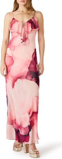 Awash in dreamy hues and framed with ruffles at the V-neck, this captivating dress is ready for the party circuit.