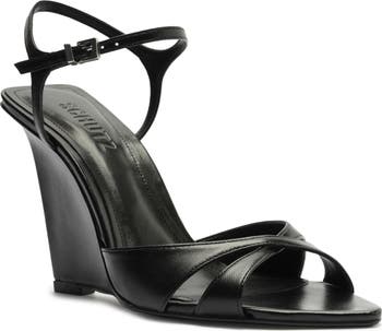 A tapered wedge heel brings striking dimension to this chic ankle-strap sandal crafted from glossy leather.