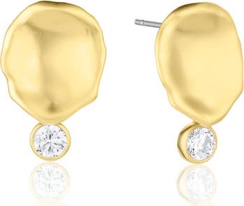 A matte finished gives an organic-inspired glint to 16-karat gold-plated discs in drop earrings anchored by bezel-set cubic zirconia.
