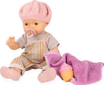 MAXY AQUINI: 16.5" BATH DOLL - BABY BEACH VIBES - Our adorable Maxy Aquini Baby Beach Vibes offers water fun wherever you go – whether at home in the bathtub or outside. Dressed in a striped romper, a lightweight knitted hat and matching bath sandals, she is perfectly outfitted for playtime in and around water. A colorful ice cream cone water toy and a cozy bath towel complete the ultimate playset for endless fun. Discover now and dive into a world of bath-time joy. PLAYFUL LEARNING & IMAGINATIVE FUN: Whether splashing in the bathtub, playing in the pool or engaging in loving role-play, this bath doll is the perfect companion for little doll parents. Thanks to its craftsmanship, she can easily join in water play and dries quickly. Not only does she support emotional development, but she also enhances fine motor skills, creativity and social interaction. She invites children to feed, cuddle and care for her, stimulating their imagination and nurturing instincts. QUALITY CRAFTSMANSHIP & THOUGHTFUL DETAILS: Our bath doll is made of durable hard-body vinyl, ensuring easy cleaning. The clothing is designed for small hands, making dressing and undressing a breeze. A pacifier adds extra fun and makes Maxy Aquini even more realistic. PLAYSET INCLUDES: 16.5" Maxy Aquini Bath Doll (approx. 700 g), Striped romper, T-shirt, Bath sandals, Knitted hat, Bath towel, Water toy ice cream cone, Pacifier. SPECIAL FEATURES: Waterproof, hard-body vinyl doll, washable, sleepy eyes. A great gift for bath-time fun.