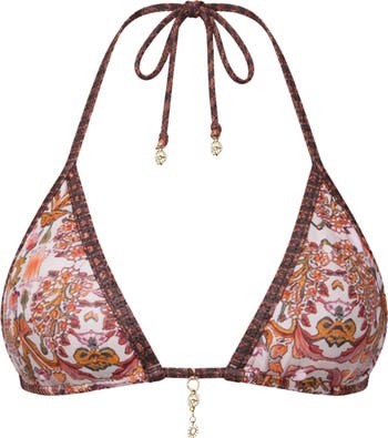 The Maya in Mosaic Print top is THE essential piece to complete your European Summer wardrobe. Featuring an intricate, Mediterranean-inspired print, this classic triangle top is elevated with a sophisticated brown patterned trim and luxurious gold charms.