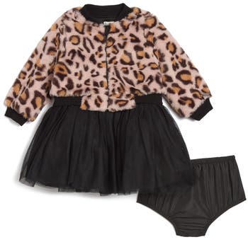 The fashion and fun will start before baby even gets to the party in this frilly dress and fluffy faux-fur bomber jacket set.