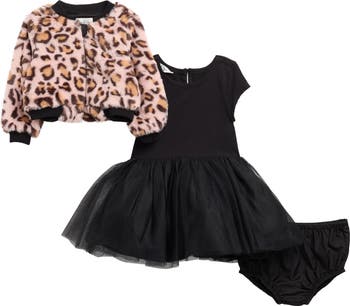 Baby can waltz into their next special occasion in full splendor with this party-ready set complete with an adorable tutu-inspired dress, matching bloomers and a coordinating faux-fur jacket covered in fierce leopard spots.