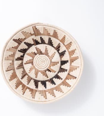 - Made from all natural, sustainably sourced raffia and banana fibers All synthetic AZO free dyes Hanging loop on back allows basket to be wall decor in addition to tabletop use Weavers hand make each basket from home while tending to other household duties. Baskets can take days to weeks to complete with artists weaving 3 or so hours per day while balancing other responsibilities. No two baskets are identical - there will be slight variations in size and color from the one shown due to the handmade nature of each product. Each basket is both special and unique. HANDMADE IN UGANDA APPROXIMATE SIZE: 13" x 5"