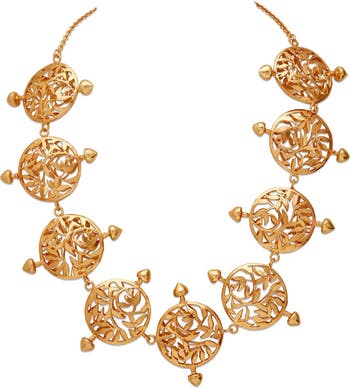 The Mayasaar Necklace is handcrafted in 22k antique gold-plated brass, drawing inspiration from Mughal architecture. Cast domes set within an intricate filigree frame create a design with depth and structure. Designed with an adjustable chain, this necklace is suitable for festive occasions, cultural gatherings, and evening events.
