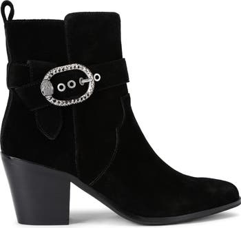 Shimmering buckle hardware embellished with a signature eagle head adds just the right touch of modern glamour to this block-heel bootie.