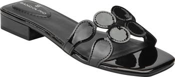 Circular appliqués line the double top strap of this sleek slide sandal fashioned with a stylish square toe and set on a nonslip sole.