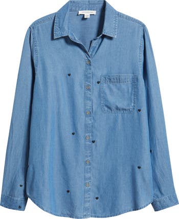 Soft and drapey chambray lends a flowy fit to this classic button-up shirt peppered with tiny, black embroidered hearts for a pop of playful romance.