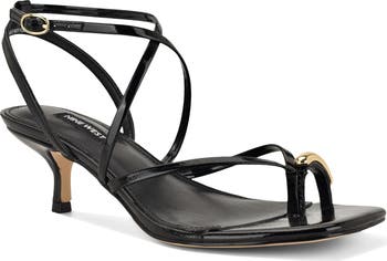 Polished hardware highlights the toe loop of this strappy sandal that adds a touch of modern glamour to any ensemble.