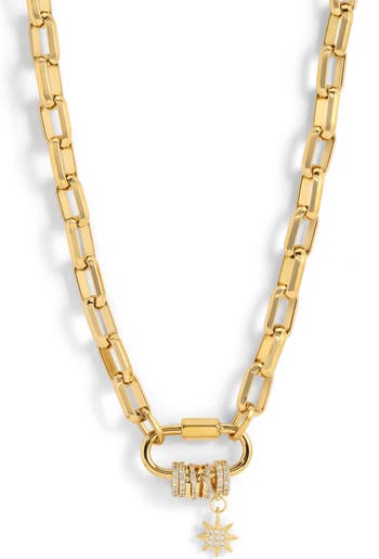 This necklace features a bold chain link design crafted from 18K gold-plated stainless steel, offering durability and a luxurious finish. At the center, it showcases a star charm encrusted with cubic zirconia stones, adding a radiant sparkle to the piece. The charm is attached to a toggle clasp, enhancing both the aesthetic appeal and functionality of the necklace.