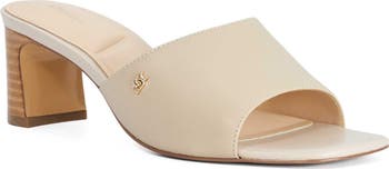 An angular square toe adds subtle dimension to a minimalist leather sandal lofted by a stacked heel.
