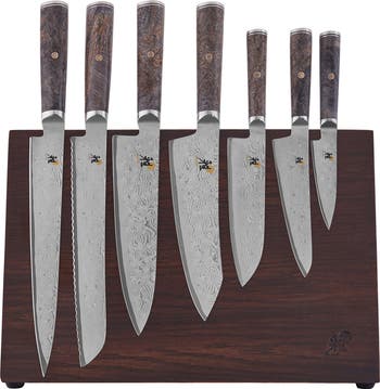 Sizing information: Includes 3.5-inch paring knife, 5.25-inch prep knife, 5.5-inch santoku knife, 7-inch rocking santoku knife, 8-inch chef's knife and 9.5-inch bread knife, plus kitchen shears, sharpening steel and storage block.