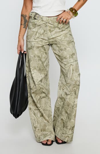 Utility-inspired with a directional edge, these camo-print jeans are cut with a wide-leg silhouette for a modern, relaxed shape. A crossover belt detail with silvertone hardware defines the waist, while a curved yoke shapes the fit. Finished with a mid-rise, they bring a statement look to everyday denim.